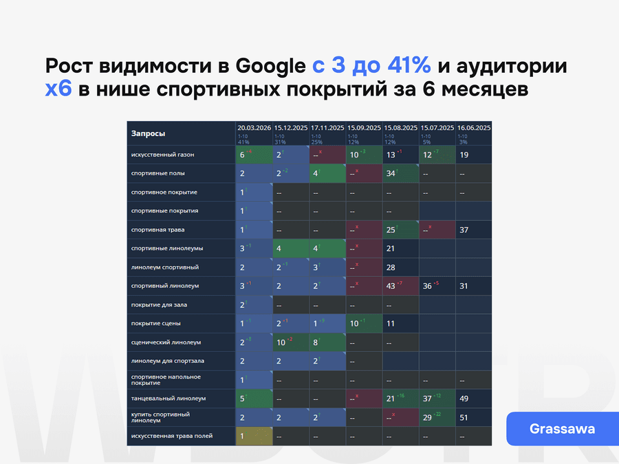 Кейс Grassawa: десктопная версия сайта спортивных покрытий с ростом видимости в поисковых системах и трафика Google на 600%